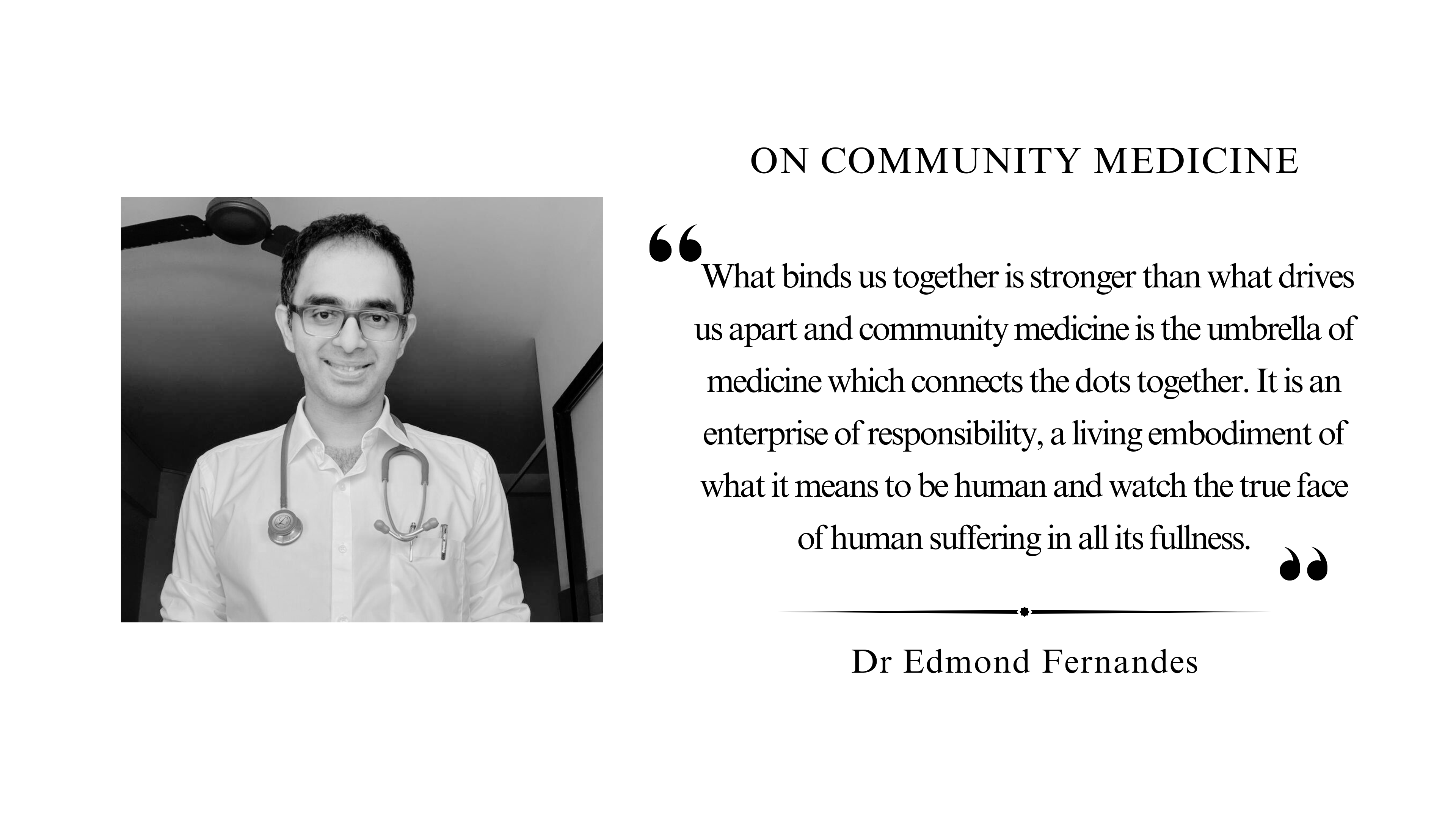 What binds us together is stronger than what drives us apart and community medicine is the umbrella of medicine which connects the dots together. It is an enterprise of responsibility, a living embodiment of what it means to be human and watch the true face of human suffering in all its fullness.