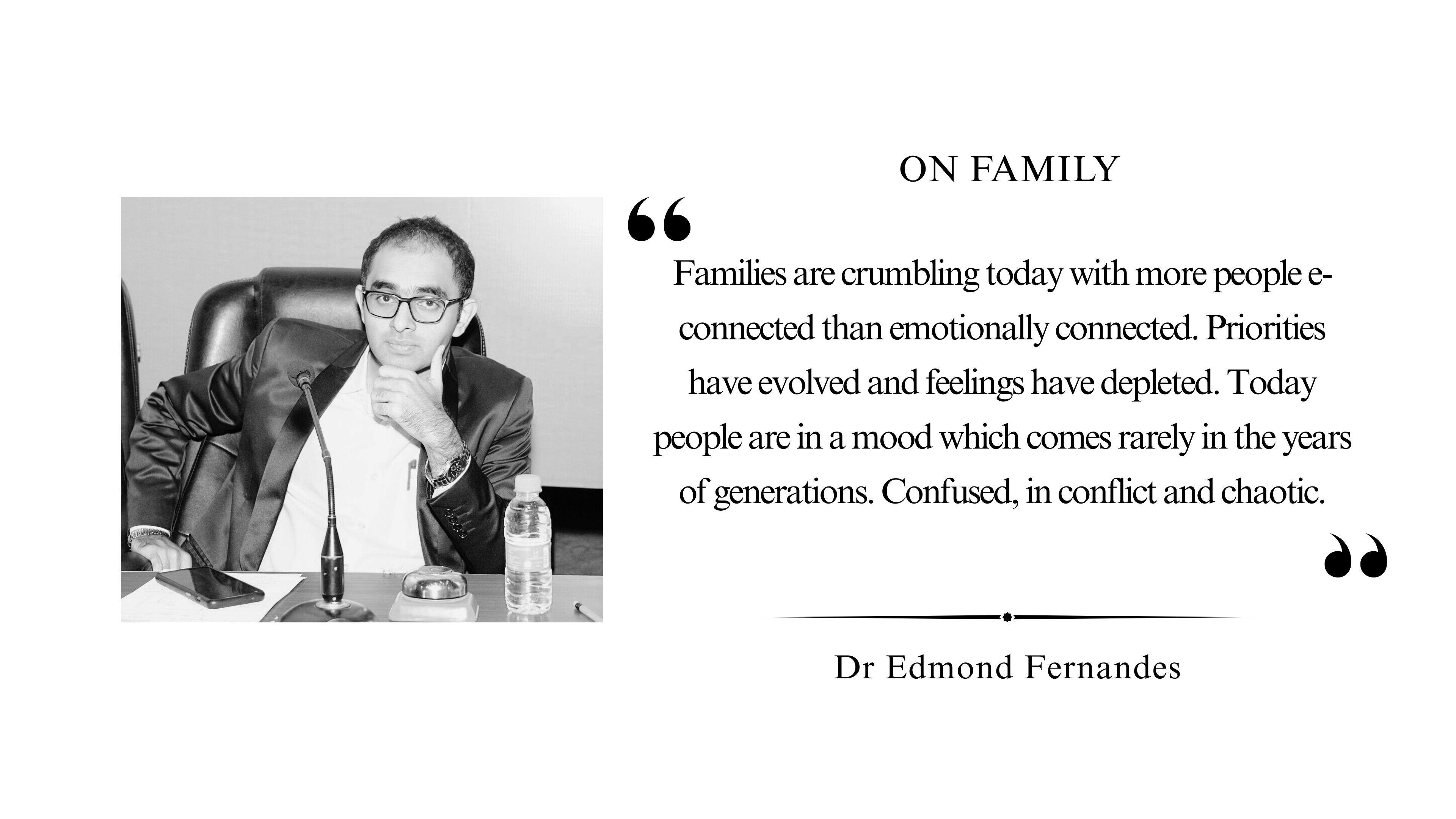 Families are crumbling today with more people e-connected than emotionally connected. Priorities have evolved and feelings have depleted. Today people are in a mood which comes rarely in the years of generations. Confused, in conflict and chaotic.