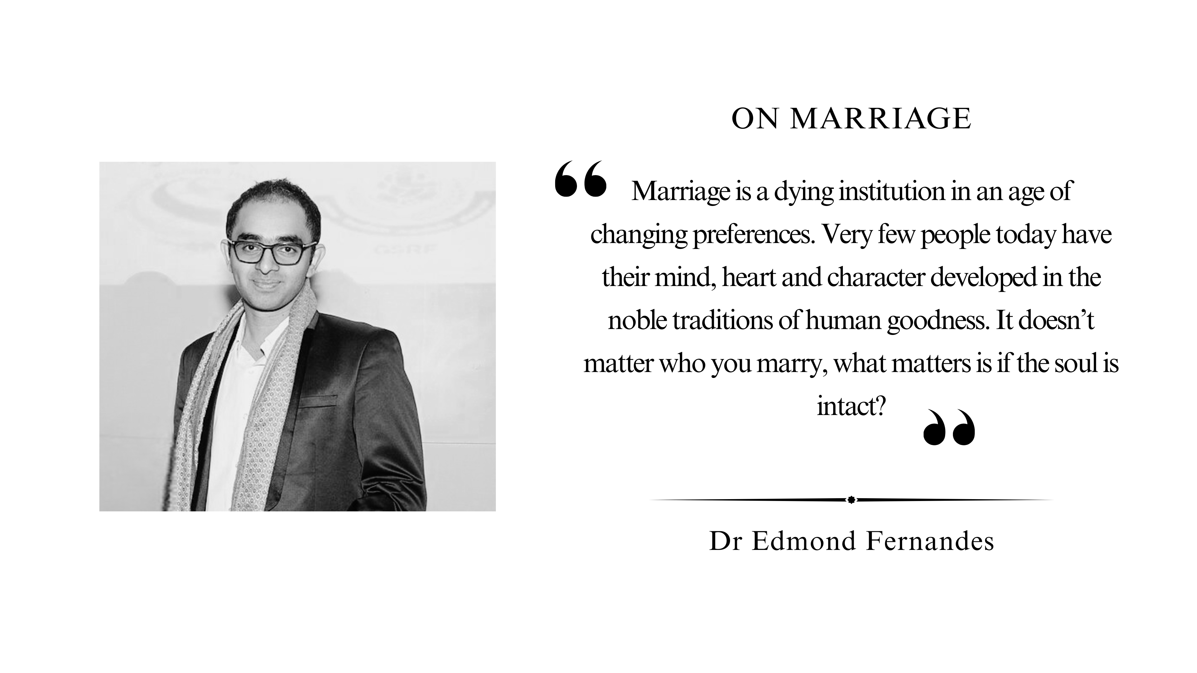 Marriage is a dying institution in an age of changing preferences. Very few people today have their mind, heart and character developed in the noble traditions of human goodness. It doesn’t matter who you marry, what matters is if the soul is intact?