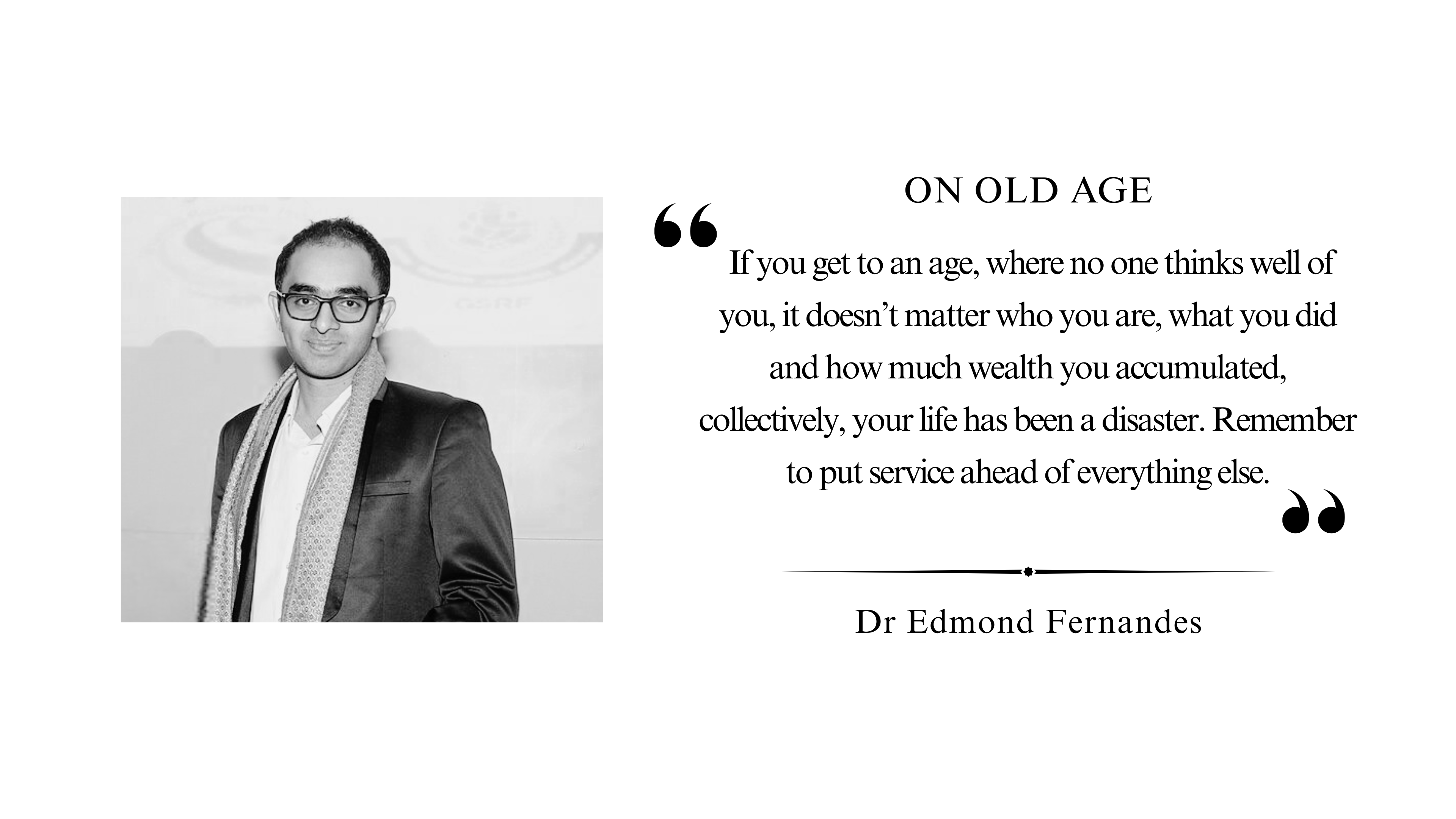 If you get to an age, where no one thinks well of you, it doesn’t matter who you are, what you did and how much wealth you accumulated, collectively, your life has been a disaster. Remember to put service ahead of everything else.
