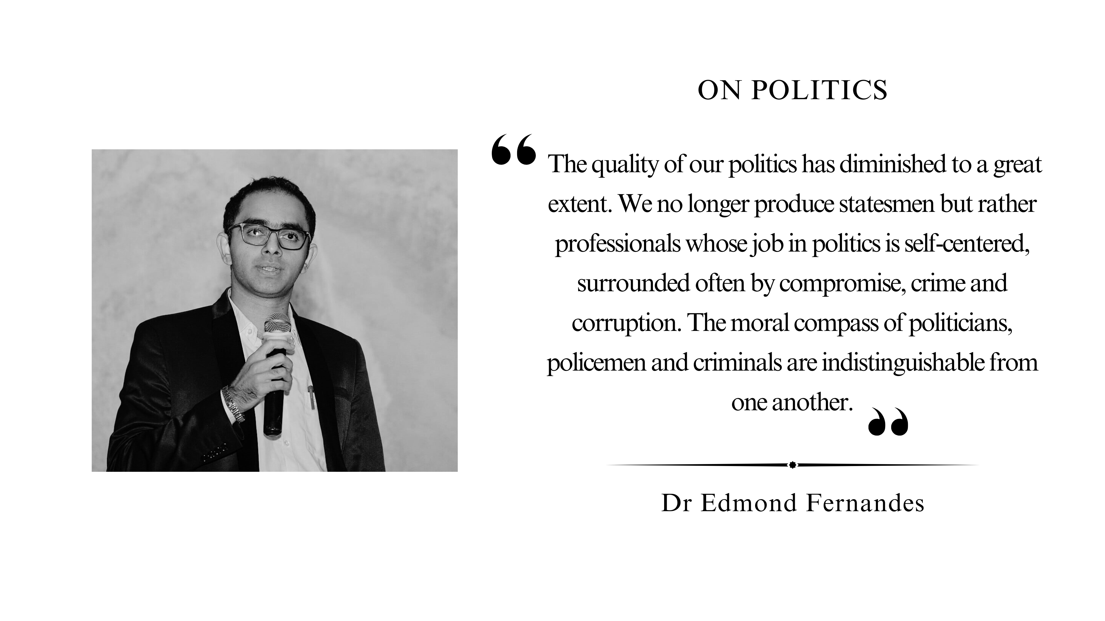 The quality of our politics has diminished to a great extent. We no longer produce statesmen but rather professionals whose job in politics is self-centered, surrounded often by compromise, crime and corruption. The moral compass of politicians, policemen and criminals are indistinguishable from one another.