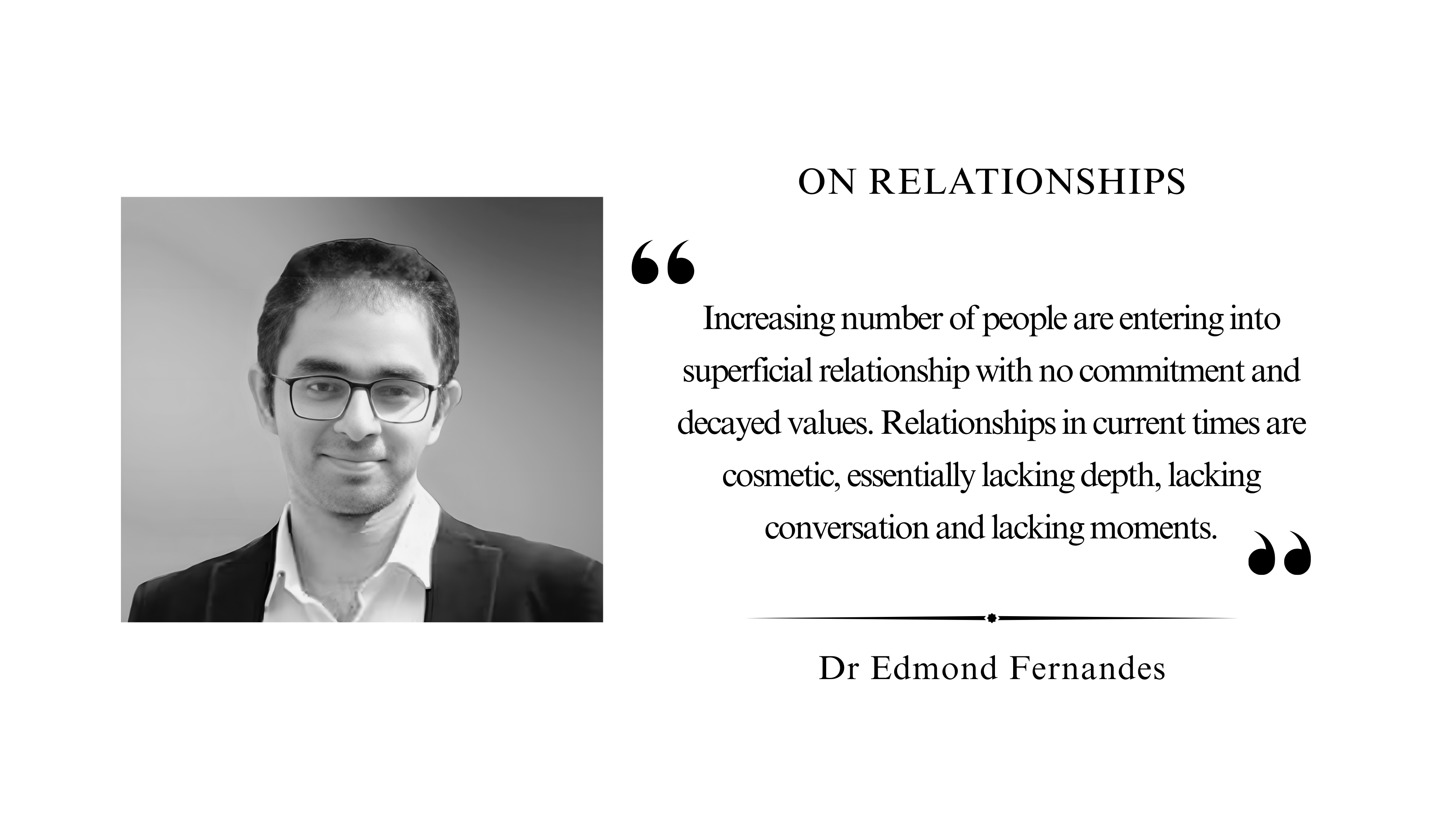 Increasing number of people are entering into superficial relationship with no commitment and decayed values. Relationships in current times are cosmetic, essentially lacking depth, lacking conversation and lacking moments.