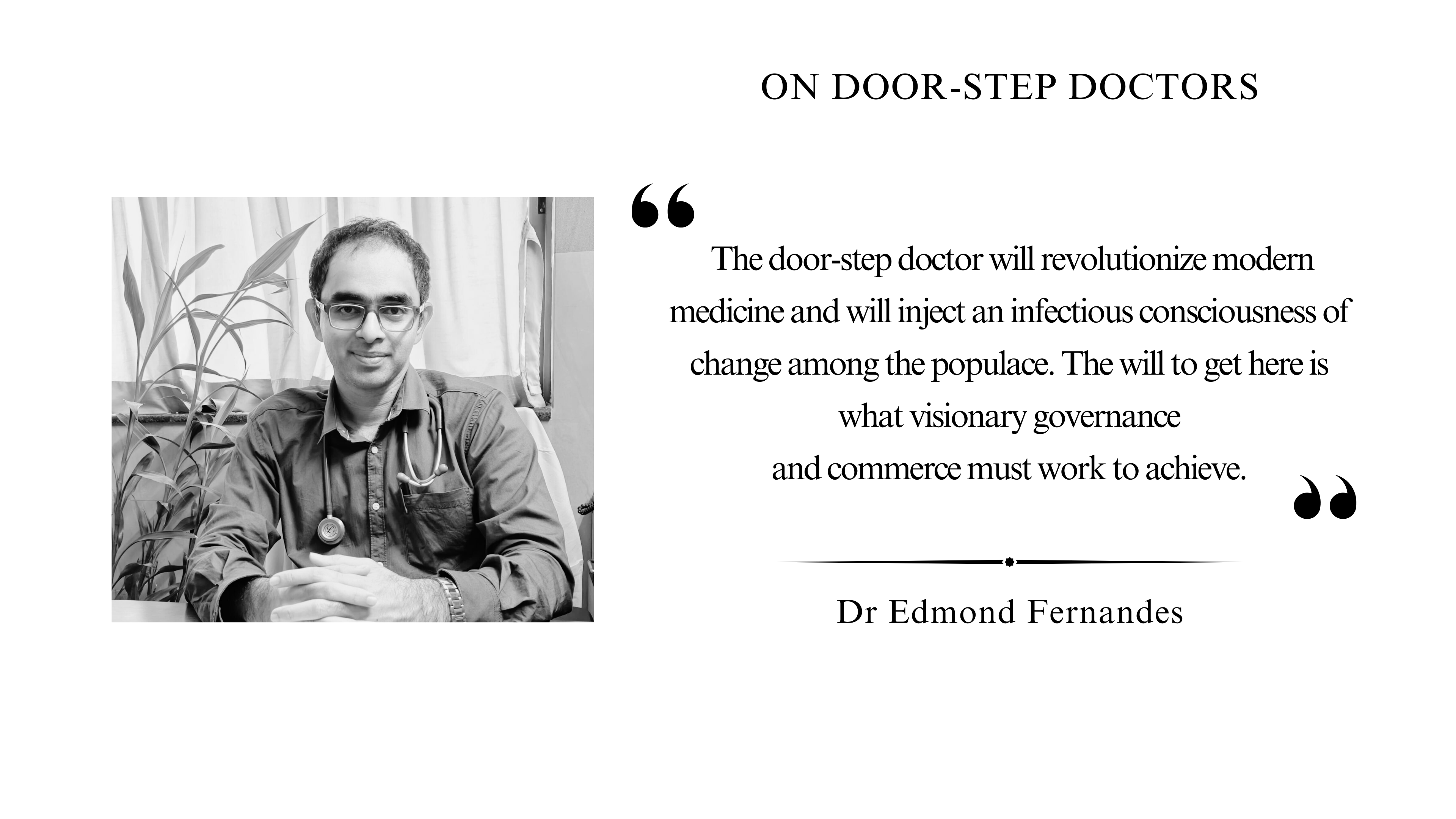 The door-step doctor will revolutionize modern medicine and will inject an infectious consciousness of change among the populace. The will to get here is what visionary governance and commerce must work to achieve.