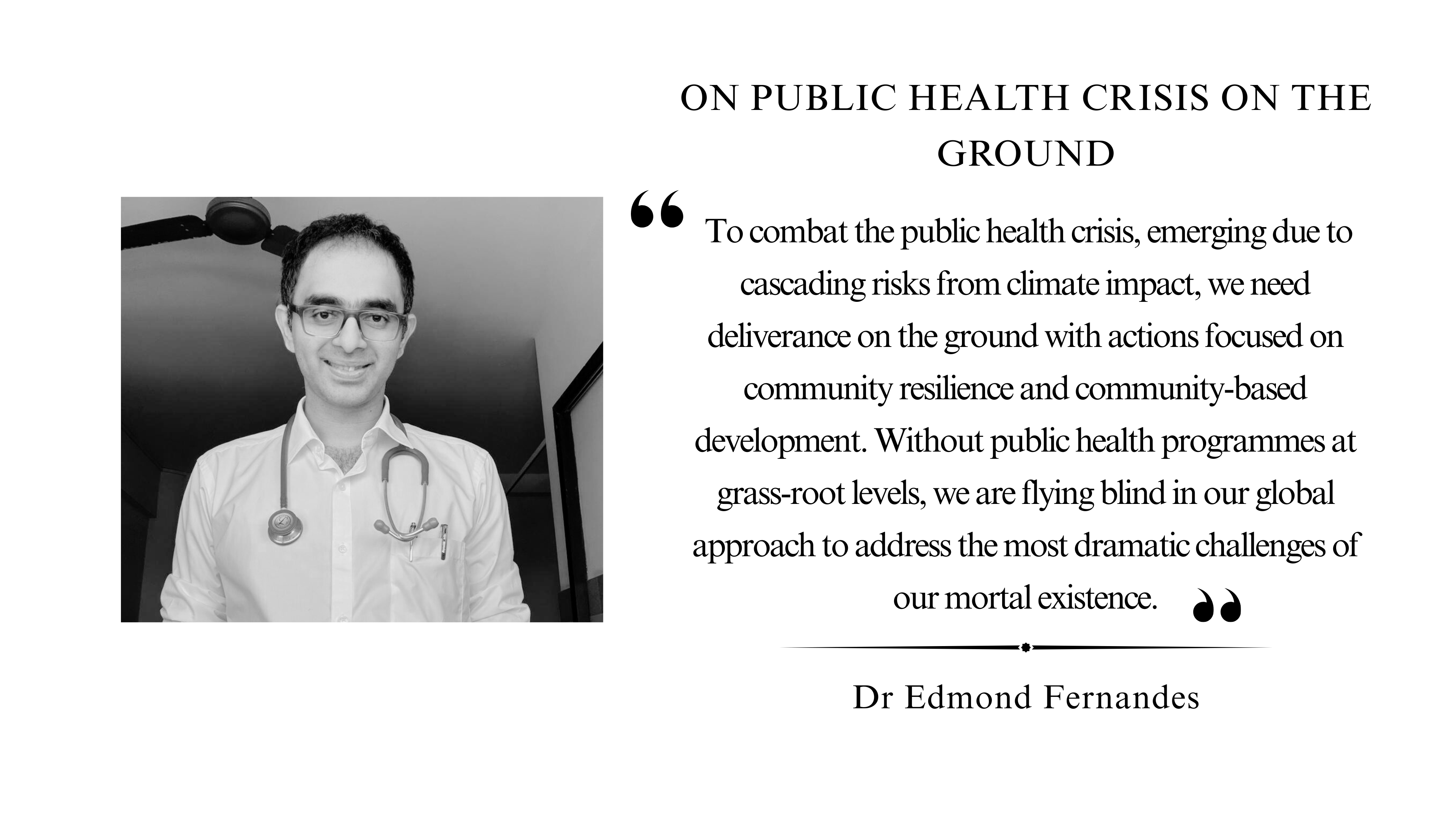 To combat the public health crisis, emerging due to cascading risks from climate impact, we need deliverance on the ground with actions focused on community resilience and community-based development. Without public health programmes at grass-root levels, we are flying blind in our global approach to address the most dramatic challenges of our mortal existence.